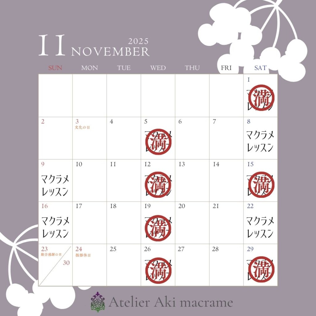 マクラメアクセサリー教室の11月のスケジュールも決まりました!